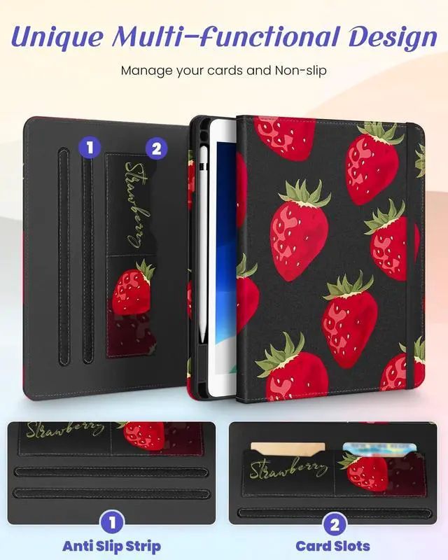 Multi-Functional Design: This for iPad case 9th generation/8th generation/7th generation features an elasticized cord strap, which ensures that your tablet closes securely, provides slip or drop protection. It also has two card slots designed to hold your bank cards business cards and other cards