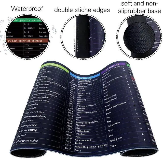Super Thick, Large & Extended SizeThe full desk XXL mouse pad measures 31.5 x 15.7 inch, Compared to the traditional 3mm thick mouse pad, we have adopted thickening technology with {4MM} thickness, make it softer and more durable. Natural non-slip rubber bottom, big enough to accommodate your computer, laptop, keyboard and other desk items, and still leave plenty of space for your mouse to move all around. ^^ Shotcuts Mouse PadThe office and adobe software shortcuts pattern design brings you a fresh feeling and is easily matched with any style of the room, office, home and desk.