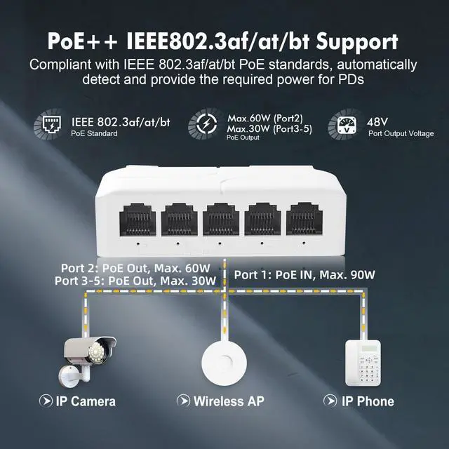 Plug & Play Support power detection automatically detect devices, just plug in the ethernet cable, connect directly to the device, led display the port status, without configuration. *Please note not support 24V passive PoE*.