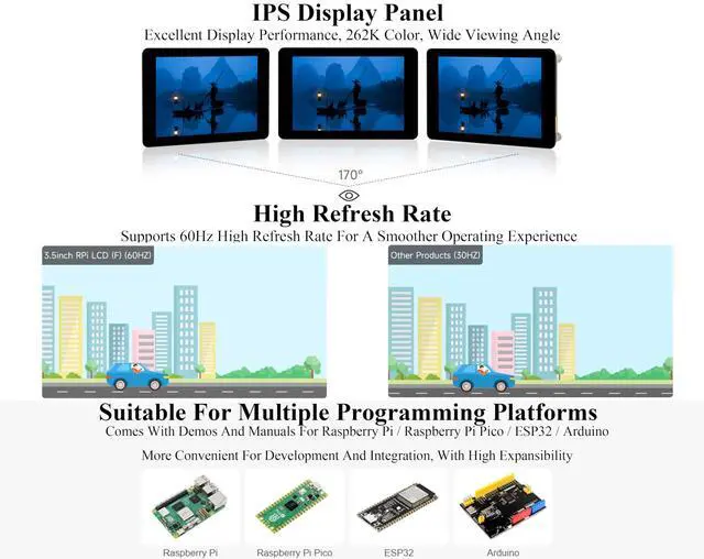 3.5 inch Capacitive Touch Display, 320 x 480 resolution, 262K color display, Compatible with Raspberry Pi / Pi Pico ( Pi 5/4B/3B+/3B/Pico /Pico W/Pico 2/Pico 2W, etc. ) and ESP32, etc. ^^ IPS Display Panel. Excellent Display Performance, wide viewing angle. Supports 60Hz high Refresh Rate for a smoother operating experience.