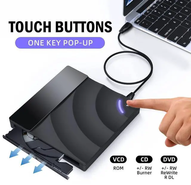 Plug and Play Simply plug the drive into your USB port or Type-C port, wait for the drive to finish installing automatically, open the compartment door, insert the disc and it will be detected and used immediately (for desktops, please connect it to the USB port on the back to avoid power shortage). ^^ Easy to carry and stylish appearanceRecessed cable design for easy cable organisation. The body is slim, sleek and minimalist, scratch-resistant and comes with a fleece pouch. This CD/DVD drive is only 1.8 cm thick and weighs approximately 0.4 kg.
