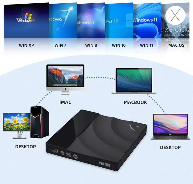 It can easily fit into your travel bag, take it with you and connect it wherever you go. ^^ High speedFeatures a dual USB 3.0 and Type C port. Maximum DVD reading speed of 8x; maximum CD reading speed of 24x. Giving you faster data transfer speeds (up to 5Gbps), play music and movies without lag or distortion. ^^ Wide compatibility It supports Windows XP/2003/Vista/7/8/10/11, Linux, all versions of Mac OS systems. (TV, car player, Chromebook, Surface Pro, Ubuntu, tablet and mobile phone are not supported).