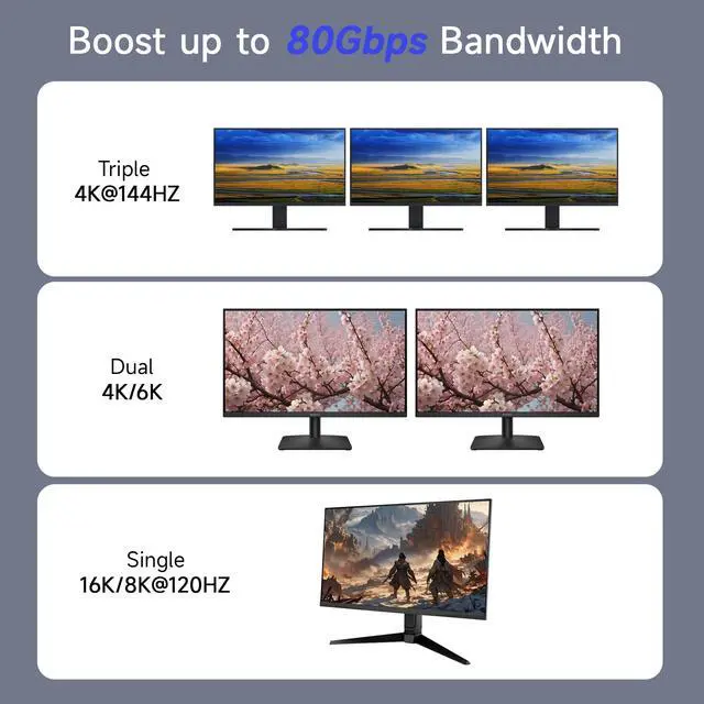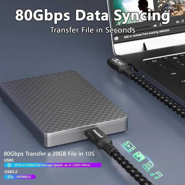 Route cables under desks, along walls, or from distant outlets while maintaining a clean, professional-looking setup. ^^ 80 GBPS SPEED, UNCOMPROMISED Even at 2 meters, experience no loss in performance. USB5 technology ensures bi-directional data transfers at up to 80 Gbps. Perfect for transferring massive files between devices that aren't side-by-side. ^^ SEAMLESS HIGH-RESOLUTION VIDEO Support single 16K/dual 8K or triple 4K displays @144Hz over a distance. Ideal for connecting your laptop to a large monitor or TV across the room, delivering flawless video and audio synchronization for work and entertainment.