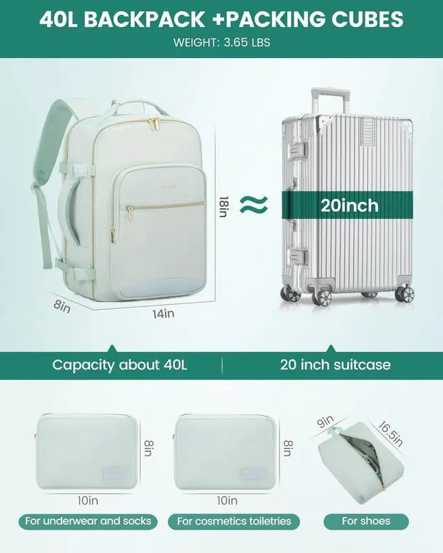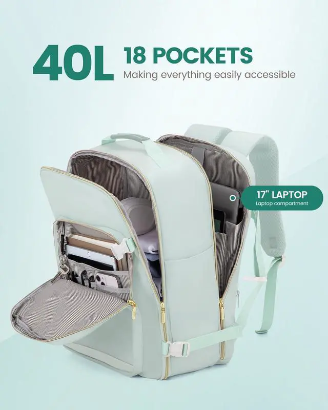 Large Capacity & Multiple Pockets: The travel backpack has a 40L large capacity and 4 main compartments, which can meet daily and travel needs. The travel backpack for women's main compartment can store a lot of things, including 5-8 pieces of clothing, shoes, books, and many other items. The separate laptop compartment is padded with EVA foam to provide the best protection for your 17" laptop and 12.9" iPad. The front compartment has many pockets to keep your belongings organized. ^^