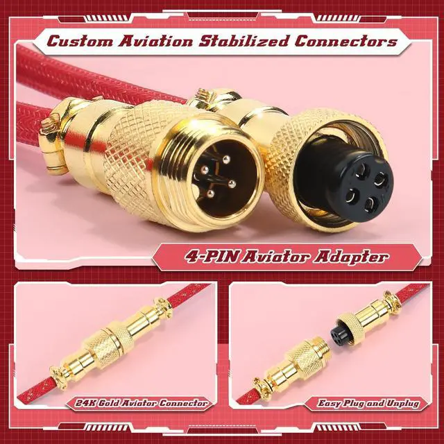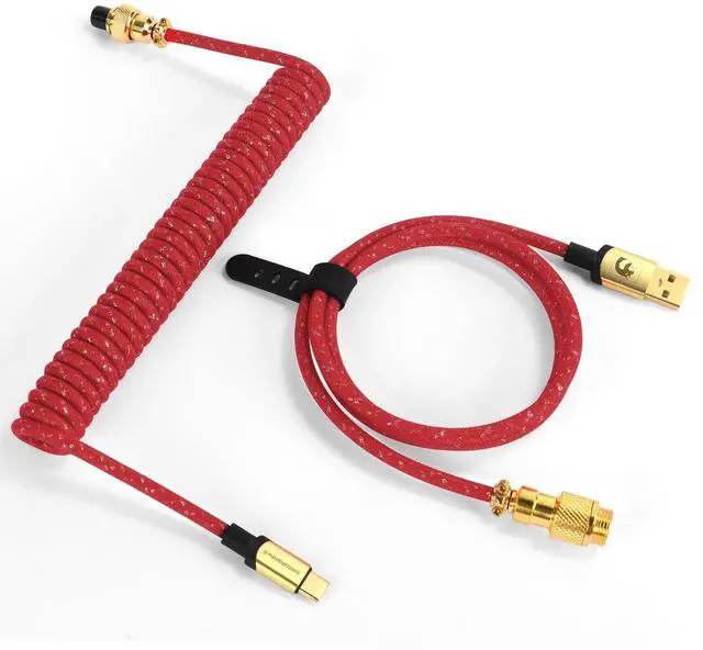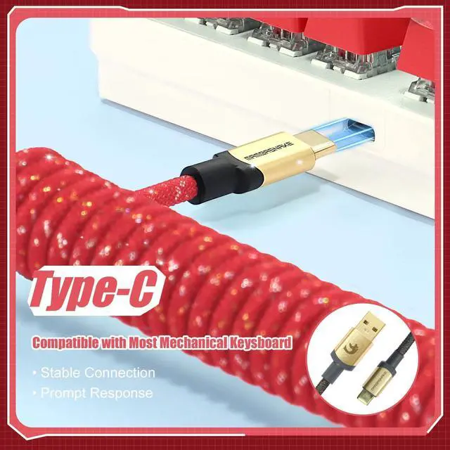 Fashion and DurableThe coiled keyboard cable uses high quality copper wire and aluminum shielding foil as the core, sturdy and durable nylon braided material with luxurious gold thread, to ensure stable transmission, resistance to pulling, not easy to break, level up your keyboards aesthetics and desktop setup with its eye-catching timeless industrial design and premier build quality. ^^ Practical 24K Gold Aviation ConnectorThis coiled USB keyboard cable adopt popular aviator connector which allows you to quickly attach different cables to your keyboard or other accessories, joining the coiled and straight section of the cable is a heavy-duty, 24K gold, 4 pin aviator, and the aviator connection part has been extra reinforced to protect them from breaking off, more stable.