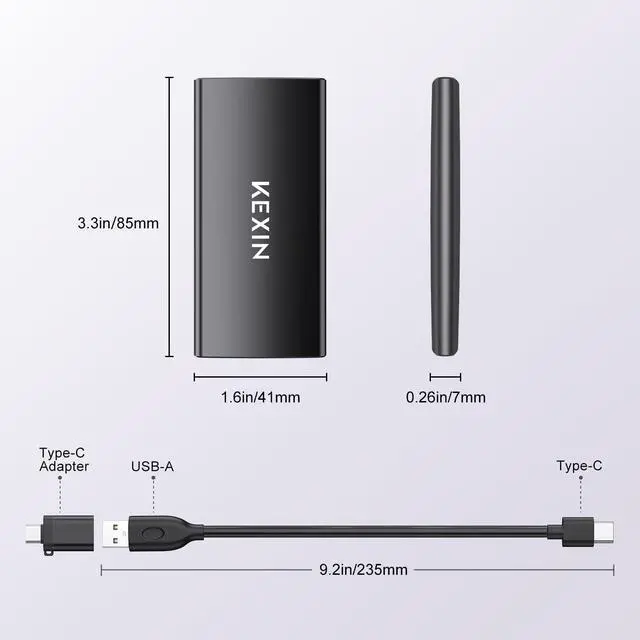 Each 256GB external SSD is rigorously tested to ensure reliable performance, taking your productivity to new heights ^^ Compact and Portable. Designed in a mini size of 85.9 x41x10mm/ 3.38 x 1.61 x 0.39 inch with 52g/ 1.83 oz weight, this mini external solid state drive 256GB could fit right in your pocket or bag, keeping your important data at hand wherever you go ^^ What You Get. 1 x 256GB external SSD, 1 x Silicone shell, 1 x USB-C to USB-A cable, 1 x USB-A to USB-C adapter, 1 x pouch, 1 x User Manual, and our friendly customer service.
