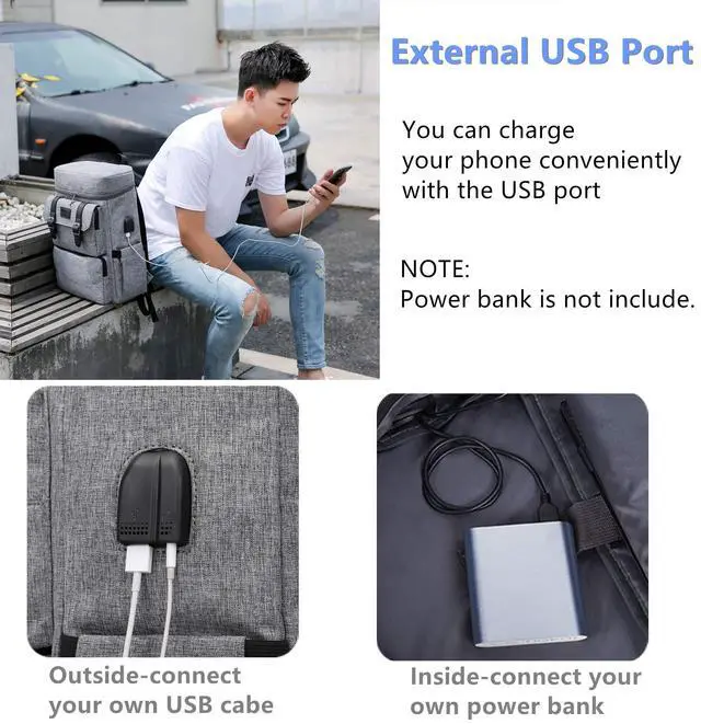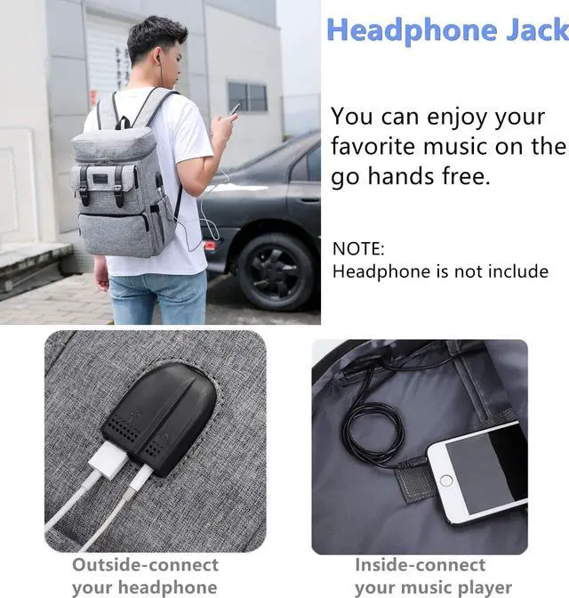 USB & HEADPHONE PORT DESIGN: With a USB charging port and headphone jack extended on the side of the backpack and built-in charging cable and headphone cable inside, provides convenience to charge your phone and listen music while travel walking work. Please noted this backpack doesn't equipped power bank. ^^ WATER RESISTANT & STURDY & MULTIPURPOSE: Made of Waterproof DURABLE ECO-FRIENDLY Polyester Fabric with REFLECTIVE STRIPE & metal zippers, offers LIGHT-WEIGHT Carrying and of force reinforcement; Breathable and adjustable shoulder straps relieve the stress of shoulder; Foam padded top handle for a long time carry on. ^^ NoteTHIS ITEM IS NOT INTENDED FOR USE BY CHILDREN 12 AND UNDER.