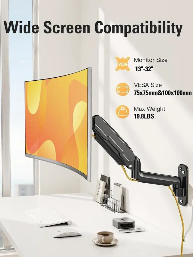 Universal Compatibility - This single monitor wall mount fits up to 32" computer screens with VESA pattern 75x75mm and 100x100mm, suitable for 32 30 28 27 25 24 23 22 21 20 19 17 inch screen, but not compatible with 1000R/1500R/1800R curved screens, and wall monitor arm holds 4.4 - 19.8 lbs ^^ Flexible Angle Adjustments - Dreamaxis vesa wall mount enables tilt from 90, swivel 180 and rotate 360. The monitor arm can be extended up to 21.6" and height adjustment up to 12.2". Easy to get the ideal position for improved comfort, and make an efficient workspace ^^ Free up Desktop Space - The monitor stand arm secures your monitor to the wall, freeing up valuable desk space.