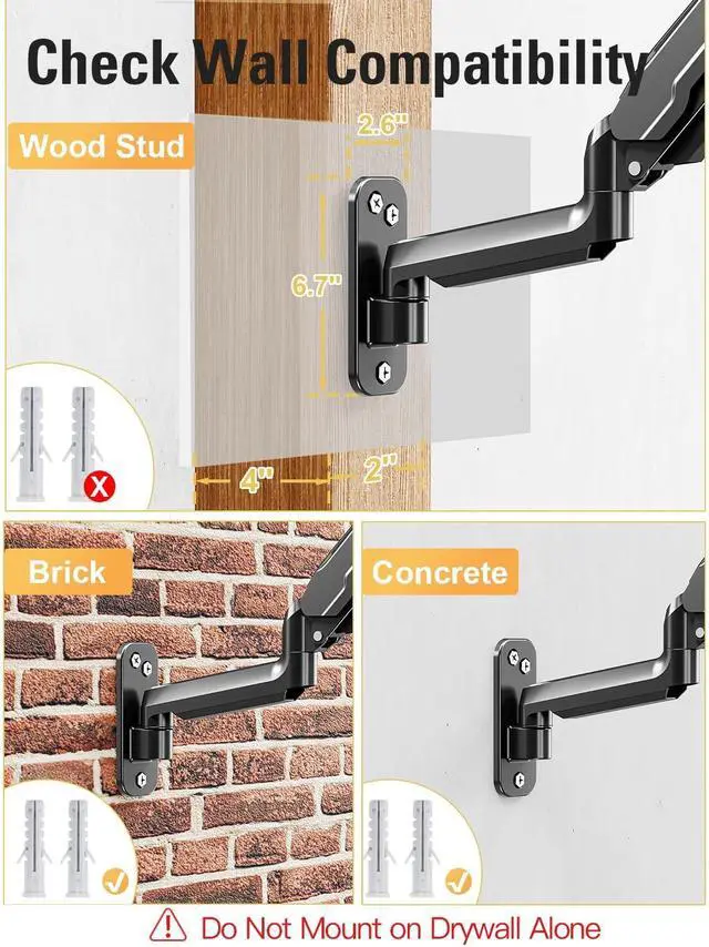 Its easy-to-remove integrated cable management system neatly conceals audio/video cables and power cords, keeping your workspace tidy and organized ^^ Advanced Spring System - The DreamAxis gas spring arm computer monitor wall mount has been engineered to withstand thousands of movement cycles, as demonstrated by its 10, 000-cycle testing. Compare to traditional mechanical spring, it provides enhanced flexibility and stability. The monitor's weight is automatically adjusted, creating a suspended, free-floating effect. Please adjust the monitor for weight before use ^^ Easy to Assemble - This monitor mount is suitable for wood stud walls and solid concrete walls.