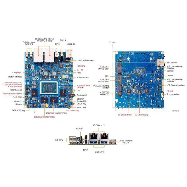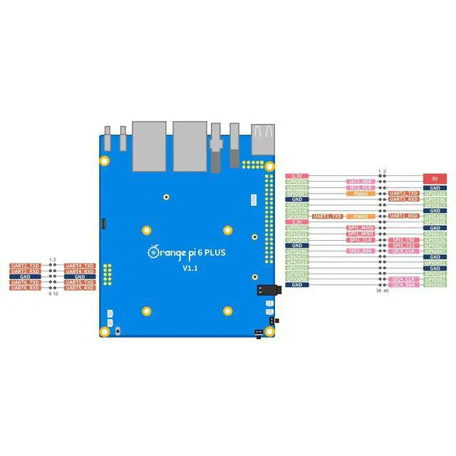 It supports multiple mainstream AI models and meets the application needs of generative AI in diverse edge scenarios, such as chatbots and AI-assisted programming. At the same time, relying on its graphics acceleration algorithm and graphics engine, it can support desktop 3D graphics applications such as games and industrial design software. ^^ Rich Ports - OrangePi 6 Plus 32G has a rich set of interfaces, including USB 3.0, USB 2.0, HDMI, 5G Ethernet, MIPI camera interface, TF slot, Type-C port power supply, 40Pin expansion connector, and fan connector, etc.