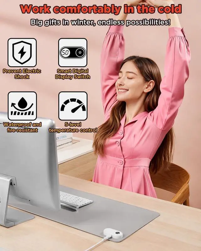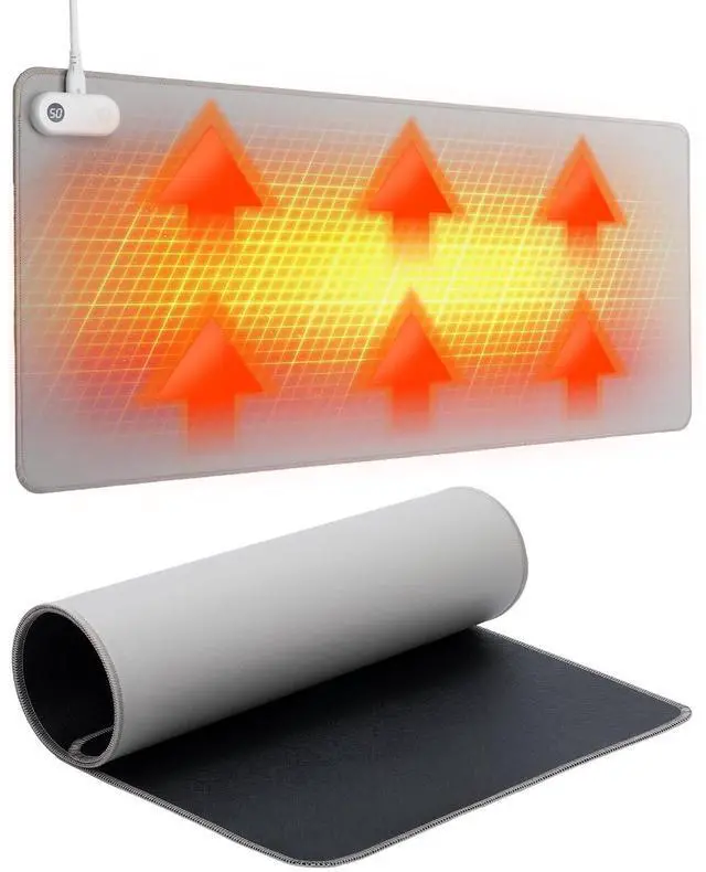 10-Second Rapid HeatingExperience instant warmth with advanced heating technology that reaches your desired temperature in just 10 seconds, keeping your hands comfortable during long work sessions. ^^ 5-Level Adjustable TemperatureChoose from 30C, 35C, 40C, 45C, or 50C with clear digital display, allowing personalized comfort for different seasons and preferences. ^^ 3-Hour Auto Shut-Off & Safety ProtectionBuilt-in safety timer automatically powers off after 3 hours to prevent overheating and ensure peace of mind during use. ^^ Premium PVC Leather & Large SizeDurable, easy-to-clean artificial leather surface measures 31.5" x 13", providing ample space for mouse, keyboard, and paperwork.