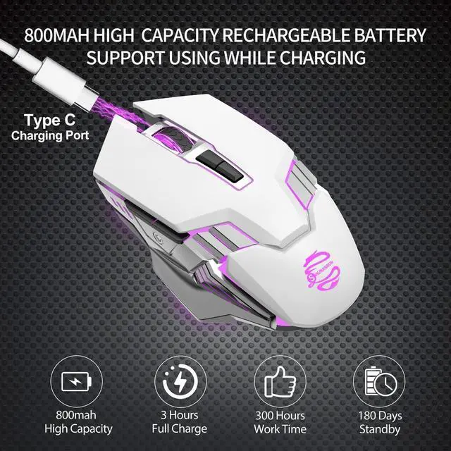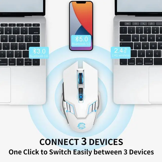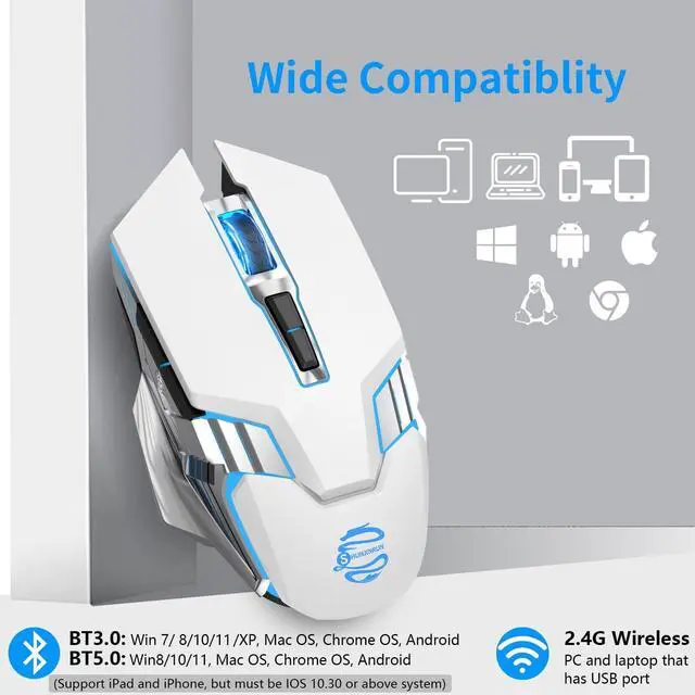 (Note: LED lights change colors automatically, and will not stay in one color, it will change regularly with 7 colors. The LED backlight can be turned on or off at the bottom power switch) ^^ ERGONOMIC FASHION DESIGN & 3 ADJUSTABLE DPI -- Tough and domineering appearance, plating double wing, skin-friendly material to fit your hands perfectly, long-term use without fatigue. Fast response, stable refresh rate, smooth tracking, precise movement, provide a fantastic using experience. 3 adjustable DPI level between 1000, 1600, 2400 meet both ordinary gaming and work, easily change the cursor sensitivity depending on your need. ^^ HIGH-PRECISION & WIDE COMPATIBILITY -- The professional Beken RF IC chip provide fantastic using experience of fast response, stable refresh rate, smooth tracking, precise movement. It is compatible with Windows 7/8/10/11/XP/Vista, Chrome OS and Mac OS system. ( P. S. Bluetooth 5.0 supports ios system for both ipad and iphone, but the ios system has to be ios 14 or later version.