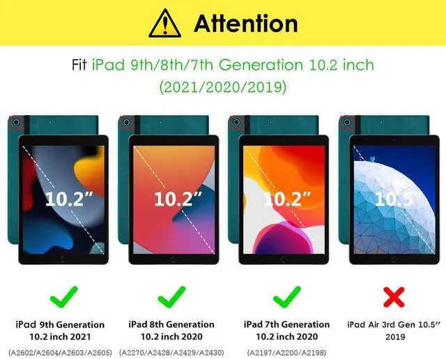 • Compatibility - Designed for the Apple iPad 9th/8th/7th generation 10.2" 2021/2020/2019 released(Model Number: A2602/A2604/A2603/A2605/A2270/A2428/A2429/A2430/A2197/A2200/A2198). Not compatible with any other iPad model