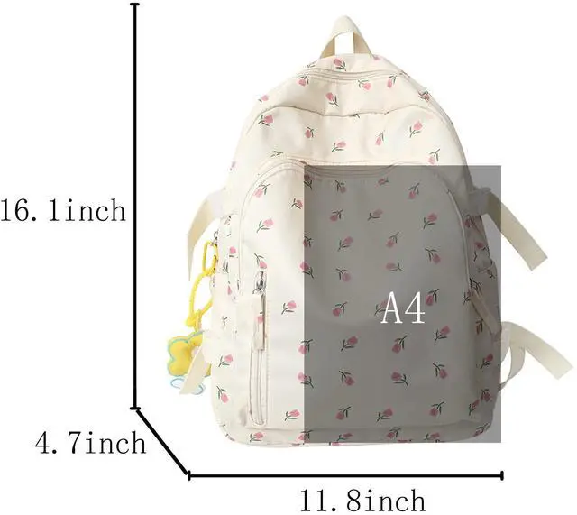 SizeKawaii backpack size: 11.8 * 4.7 * 16.1 inches (L*W*H), the weight of the backpack is about 0.43KG. ^^ MaterialThe lovely backpack is made of breathable and wear-resistant nylon fabric, which is waterproof, wear-resistant and shock-proof. Sturdy construction with fine stitching for a streamlined look. Lightweight yet durable and sturdy. ^^ Capacity The capacity of the bag is about 20L. Main compartment with double zipper closure with phone pocket, ID pocket, computer socket; large enough to hold magazines, 14" computer, tablet, glasses, wallet, keys, headphones, power bank, phone, documents and clothes. ^^