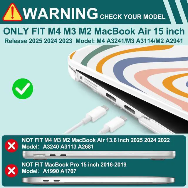 Compatible With - Only for M4/M3/M2 MacBook Air 15" 2025 2024 2023 (Only compatible model: A3241/A3114/A2941). Please confirm the model on the bottom of the MacBook before ordering ^^ Durable Material - MacBook Air 15-inch case is made of hard PC material, effective anti-slip/shockproof/anti-scratch etc ^^ Case Design - The case adopts the top and bottom case separation design, easy to install and remove ^^ Case Port Design - Precise cutouts allow full access to all ports, features, buttons, and Touch ID functionality ^^ Package - Included 1 MacBook Air 15 inch Case, 1 Keyboard Cover, 1 Trackpad Protector, 2 OTG Adapter