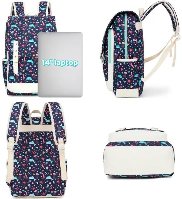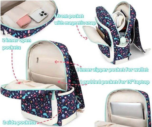 Cute Aesthetic Backpack Construction: back pack for school girls, the main compartment can put notebooks, magazines, A4 files; 2 side pockets can carry a water bottle and an umbrella; 1 inner zipper pocket for wallet; 1 front pocket with magnetic snap perfect for pencils, an iPad, passport, tickets, etc.; 2 inner open pockets to store a cellphone or small electronics; 1 padded laptop pocket to hold most 15 in laptop or below 15in. ^^ Cute Backpack for