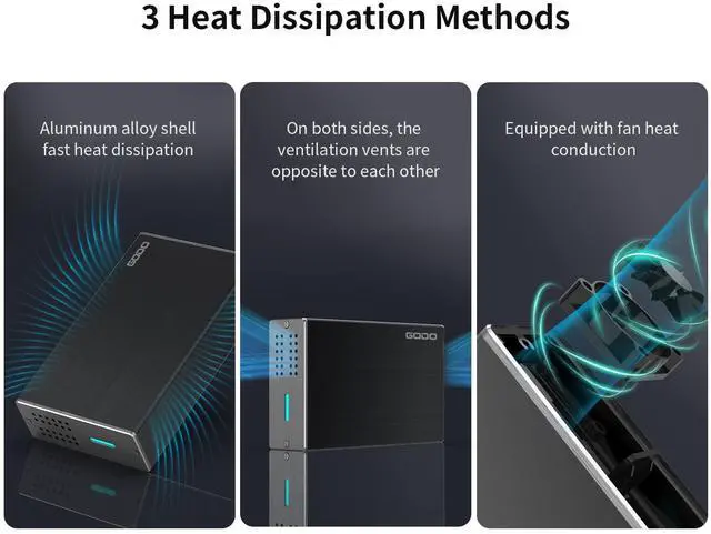 (NOTE: additional power is required when using this enclosure) ^^ Triple Heat Dissipation with Fan1. Aluminum alloy shell, fast heat dissipation, 2. Air absorption and heat conduction, no fear of high temperature. The honeycomb type heat conduction through the front panel is coupled with a heat dissipation fan to suck out the internal hot air at one time to increase the air flow speed, which can quickly dissipate heat. 3. A heat dissipation hole is provided at the other end of the fan to allow the air to flow quickly and dissipate heat.