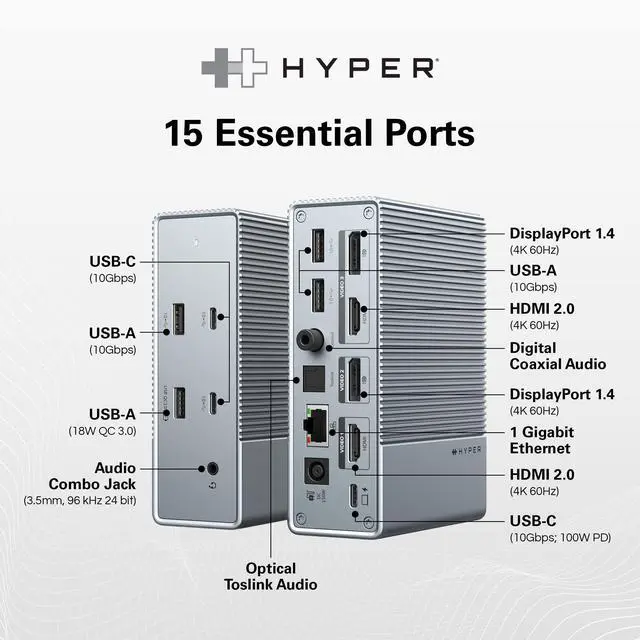 ^^ FAST AND RELIABLE GIGABIT ETHERNET - Get the most reliable and fastest internet connection for work, play, and video conferencing with our MacBook docking station. Setup is easy with driverless plug & play capability, allowing for easy installation and deployment. ^^ PRO-GRADE DIGITAL AUDIO - Capture and listen to the best sound quality possible with digital coaxial and optical fiber TOSLINK input and output. Our laptop dock station is designed to bring out the best in your audio and HDMI accessories. ^^ HYPER INNOVATION - HYPER creates award-winning, cutting-edge IT and mobile accessories that focus on compatibility with Apple, portable power, and connectivity.