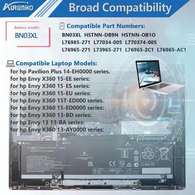Color: Black. 100% brand New from Manufacturer. ^^ Fits Models for hp Pavilion Plus 14-EH0000 seriesEnvy X360 15-EE 15-ES 15-EU 15M-EE seriesEnvy X360 13-BD 13-BA 13-AY series. ^^ Compatible P/N BN03XL, HSTNN-DB9N, HSTNN-OB1O, L76985-271, L77034-005, L770374-005, L76965-271, L73965-271, L76965-2C1, L76965-AC1.