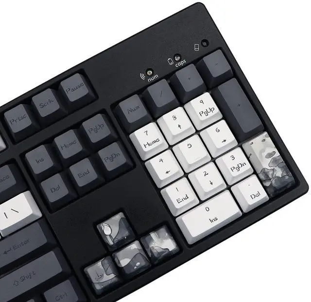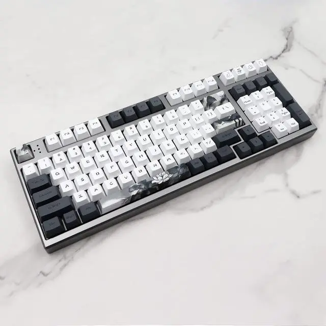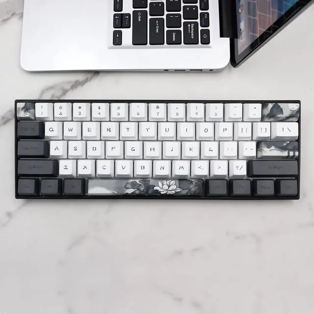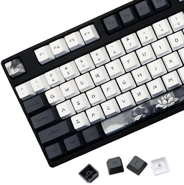 Wide compatibilityThis set of keycaps has a large enter key, fit for ISO layout keyboards. Compatible with GK61/64/84/87/96/98/104/108 mechanical keyboards compatible with most MX switches, such as Cherry MX switches and clones, including Gateron, Outemu and Kailh ^^ PBT Dye-Subbed KeycapsKeycap is made of oil-resistant PBT material, compared with ABS, PBT has better hardness, more wear resistance and high temperature resistance ^^ OEM Profile Keycaps OEM Profile keycaps have a trapezoidal design with R1-R4 layout with different height and angle slope, which is ergonomic and makes typing easier and more enjoyable ^^ Easy Installation140 Chinese ink lotus theme keycaps, unique and beautiful, ergonomically designed OEM height, designed for backlit/non-backlit mechanical keyboards, easy to install ^^ What you get-1x140 keycap set (including puller); keycap only, keyboard not included