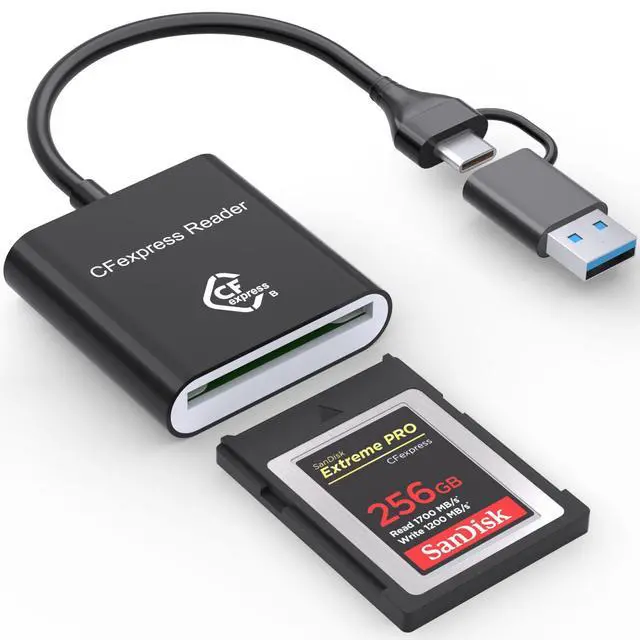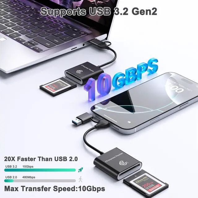 CFexpress Card Adapter: CFepxpress Type B card reader supports USB 3.2 Gen2 (10Gbps) super speed data transfer for your CFexpress card. In order to reach 10Gbps high speed, the USB/USB C port of your devices must reach the speed of USB 3.2 GEN2.