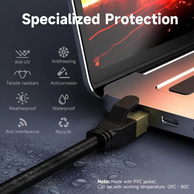 Weatherproof & UV Resistant: Network Cable Shielded with high quality UV-resistant PVC jacket, the outdoor rated Cat8 Ethernet cable is anti-aging. It can withstand direct sunlight and extreme cold & humid & hot weather yet still working efficiently.