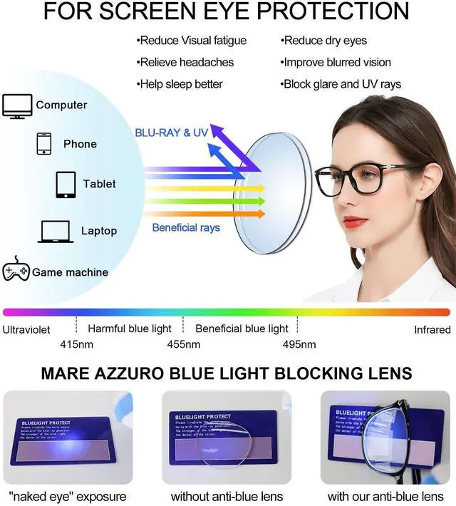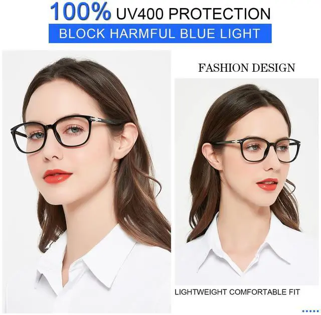 ^^ Clear vision - Accurate blue light filtering magnifying lenses can effectively cut high-energy blue ray, minimize screen glare and block UV400. Restore true color, no blur and no distortion; Big frame design gives you a wide vision to see small print and minute details easily without turning you neck frequently. Also have + 1.00 to + 6.00 degree to meet your actual need. ^^ Comfortable fit - Ultra lightweight and sturdy reader glasses only 11.9 g, no pressure on ears and nose for a all-day comfort; with durable metal hinge, firm and not easy to slip off, so ideal for scholars, workers and gamer to read, work, and enjoy digital time.