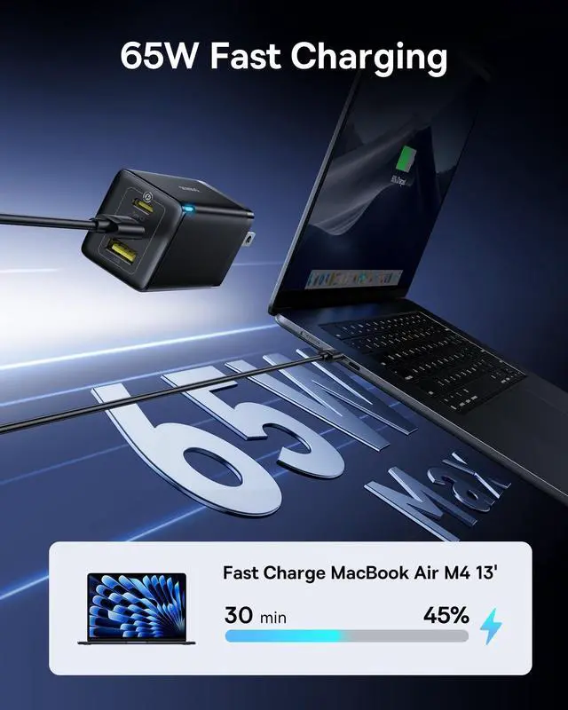 Devices: Connect a single device for a powerful 65W max charge enough to fast-charge a MacBook Air at full speed. Effortlessly charge up to three devices simultaneously (USB-C + USB-C + USB-A). Intelligent technology dynamically allocates the optimal wattage (up to 65W total) to each connected device for safe, efficient charging every time.