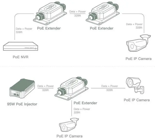 With daisy chain 4 units, it can extend for a total distance of up to 500m (1640 ft. ), and 1000 Mbps gigabit transmission is available. The extender features in easy installation and no requirement of extra power supply, and it is used between power source equipment (PSE) and a powered device (PD). There are two ports for you if you have the demand for supporting 2 remote IP devices. The PoE extender provides convenient wall mountable design for installation flexibility.