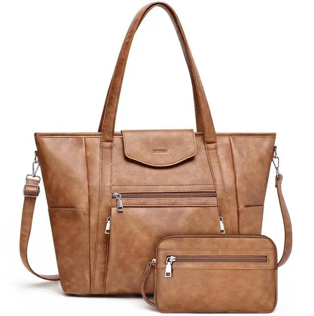 Handbag size: 9.7"L * 6.4"H. The comfortable size & hidden back straps and built-in buttons can transform a handbag into a computer bag. There may be slight errors due to different measurement methods ^^ Water-Resistant & Easy to Maintain- This leather laptop bag is made of soft faux leather, which is stylish and elegant. The smooth zip doesn't get stuck. Wider strap design which is Comfortable and does not tighten the shoulder, ensuring comfort throughout the day. The design of the luggage strap allows the laptop bag to be placed on the suitcase to free up hands, and it can be used as a travel laptop backpack carry-on the plane and a backpack for short trips lasting 2-3 days ^^ Ideal for Work, Daily use, Travel & Gifting- Convertible style and function, this 4 IN 1 laptop bag is perfect for work, travel, or daily uses. The simple, retro and exquisite style is deeply loved by mothers, lovers and other women. It is a great gift for birthdays, Mother's Day or graduation, and an ideal choice for those who value both fashion and practicality