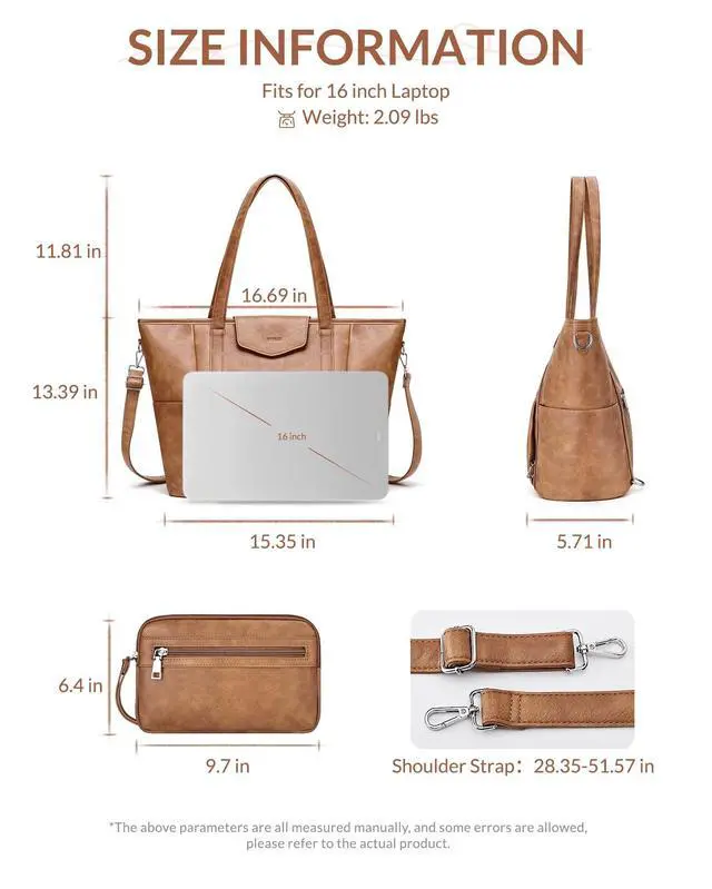 It can hold laptop, clothes, magazines, A4 files, keys, passports, phones and other items. The multi-pockets design keeps your everything in good order ^^ Comfortable Size- The laptop tote bag size: 16.69" - 15.35" W * 5.71"D * 13.39"H, weights 2.09 lbs with adjustable & removable 28.3551. 57"shoulder strap.