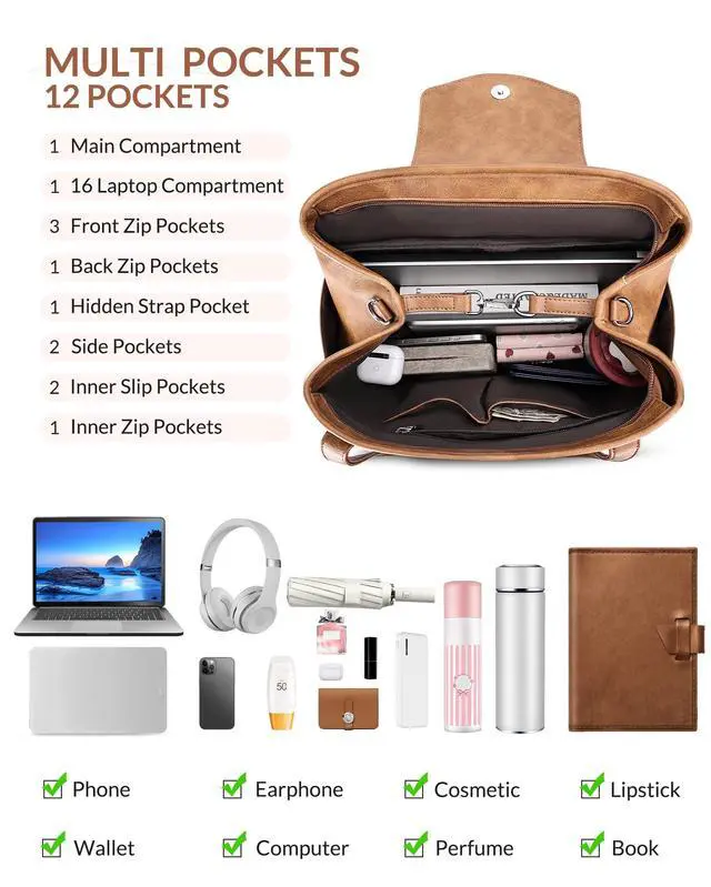 As a Laptop Backpack or a Laptop Tote Bag- This designer laptop bag is a stylish and practical laptop bag for women. The hidden back pack strap is designed to convert the laptop bag into a laptop backpack, and the detachable shoulder strap can be converted into a shoulder handbag. The various carrying methods such as handbag, back pack, shoulder purse and tote bag are suitable for everyday use ^^ Multi-pocket & Large-capacity, Easy Storage for Everything- This womens laptop bag has 12 pockets, including 1 main compartment, 1 built-in laptop pocket (which can hold a laptop no larger than 16.5 inches, effectively protecting the device from collision), 4 external zip pockets, 1 hidden back strap pocket, 2 side pockets and 3 inner pockets.