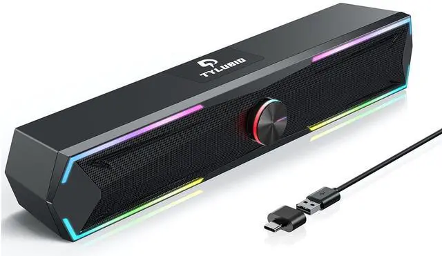 LED modes on monitor speakers: rainbow color flowing - changing color pulsing - single color changing - select a solid color - light off. This PC speakers fit your setup seamlessly. ^^ All In One Compact - Dimension of computer soundbar is 15.7 * 2.7 * 2.5 inch (L*W*H), cable length is 2yard/ 1.8 meter. It is perfect to place laptop speakers under the monitor, or other space on your desk. ^^ Stereo Sound - The PC speaker uses upgraded 2x5W technology to deliver the clear sound. The soundbar speaker can enhance your listening experience when you enjoying indoor movies, videos, music and games. ^^ Easy-Access Control - Click the knob to switch USB input/Bluetooth, double-click the knob to pause/play, triple-click the knob to change LED lighting modes, quadruple-click the knob to reset Bluetooth connection (Only bluetooth mode), press the knob 3 seconds for power on/off. ^^ Type C Adapter Included & Compatibility - USB speakers match computers, desktops, PCs, laptops, iMacs, MacBooks. Suitable for windows(Vista/7/8/10), Mac OS, Chrome OS, etc. (Not 3.5 mm AUX)
