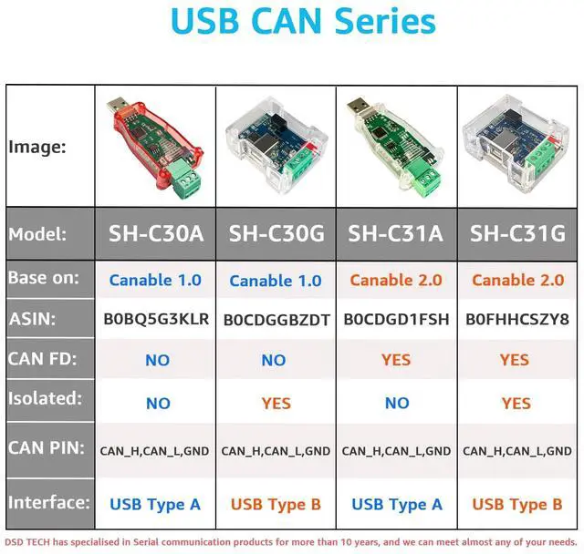 BPacking list: 1 X SH-C30G USB to CAN1 X User manual1 X USB Type B Cable(1M/ 3.2FT )WARRANTY: DSD TECH offers a 12-month warranty on this Isolated USB Canable Adapter. If you have any questions, please contact us and we will resolve your issue within 24 hours.