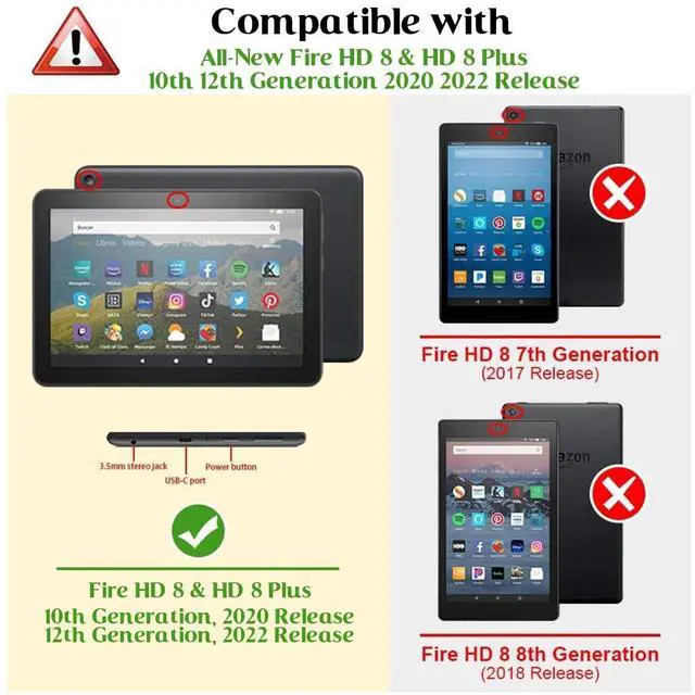 Compatibility withDesigned specifically for Kindle Fire HD 8 Tablet & Fire HD 8 Plus Tablet (12th/10th Generation 2024/2022/2020 Release) ONLY. NOT Fit Old HD 8 2016-2018 Release (8th / 7th / 6th Generation) / HDX7 / Fire 7" / HD 10 / any other device. Slim and LightweightLightweight case design protects your 2020 Fire HD 8 tablet without adding bulk. Auto Wake/Sleep FunctionMagnet secures your device with straps covering the front. Support the auto Wake / Sleep function. MaterialMade from durable synthetic leather with soft TPU interior to prevent your Fire HD 8 / HD 8 Plus tablet from finger prints, dirt and scratches.