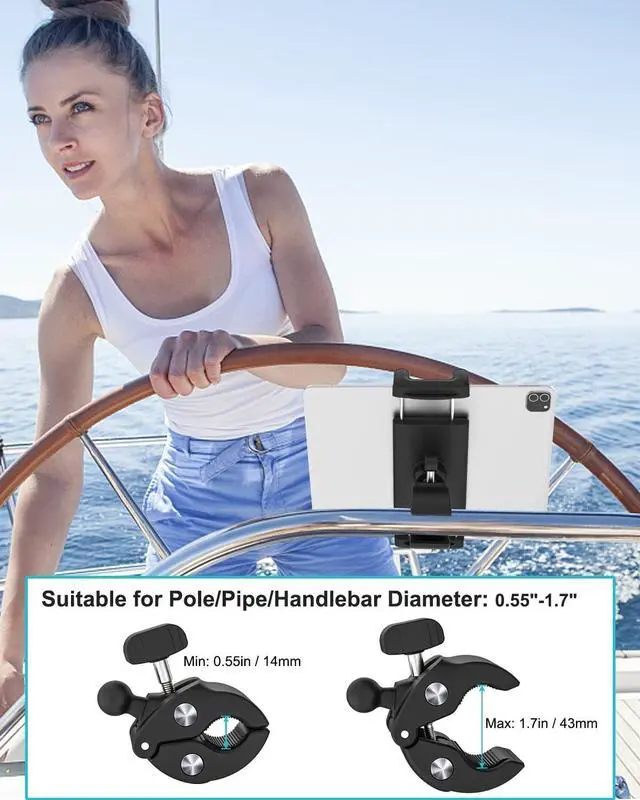 and rails diameter: 0.55 - 1.7" (14 - 43mm). Fits for sail boat, fishing boat, speed boat, pioner boat, sea fox boat, yacht, sailfish boat, motorboat, quicksilver boat, orion plate boat, draco boat, rayglass boat, veitch boat, rhib boat, zodiac boat, dinghy, etc. ^^ More Secure & StableThis ipad mount for boat is made of high quality ABS, can hold your tablet/phone stably in the place even in the rough water or strong winds conditions. The clamp equiped with anti-slibe rubber to ensure great stability and keep from scratches. ^^ 360 Adjustable AngleTablet pole mount with universal ball design can be rotated 360 and 180 tilt to provide you a best viewing angle(horizontal & portrait). Convenient for tablet navigation, music, movies, fishing and other boating activities. ^^ Wide CompatibilityBoat helm rail tablet holder is fit for all 4-13 inch screen mobile phones and tablets, compatible with iPad Pro 11 12.9 13, iPad 10.2 (10th/ 9th/ 8th/ 7th generation), iPad Air 6 5 4 3 2, iPad mini 2 3 4 5 6 7, Galaxy Tab S9 S8 S7 S6 A8 A7, iPhone 16 15 14 13 12 11 Pro Max, iPhone 16 15 14 Plus, iPhone 13 12 Mini, iPhone Max Xs XR X 8s, Galaxy S22 S24 S23 S22 S21 Ultra / S21+ Plus / S21+ / S21 / S20 / Note 20 Ultra / Note 20, and more.
