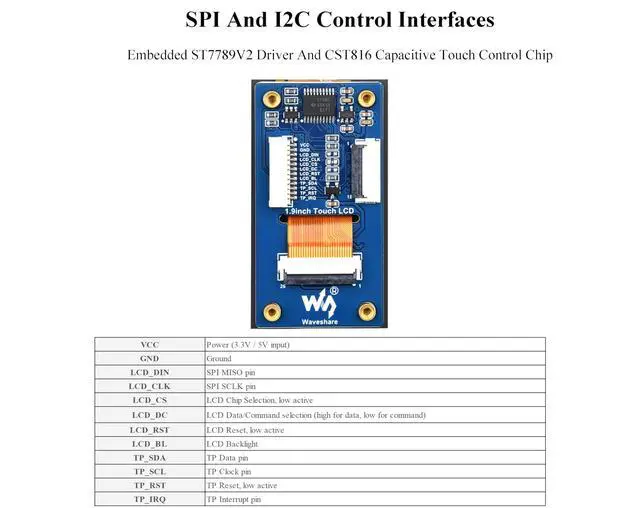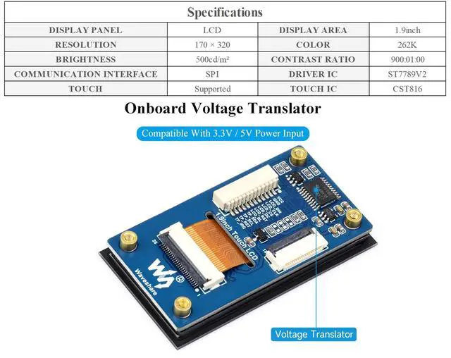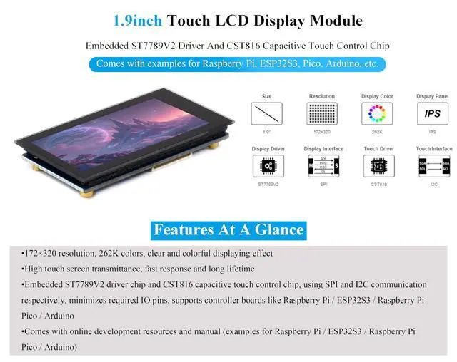 This is 1.9 inch Touch LCD Display Module, 172x320 resolution, 262K colors, clear and colorful displaying effect, 500cd/m Brightness, SPI and I2C Communication. ^^ Adopting capacitive touch, the touch response speed is fast and the precision is high. The screen has high transmittance, smooth touch operation and long service life. ^^ Embedded ST7789V2 driver chip and CST816 capacitive touch control chip, using SPI and I2C communication respectively, minimizes required IO pins, Compatible with Raspberry Pi, Pi Pico, ESP32S3, etc. ^^ Onboard Voltage Translator.