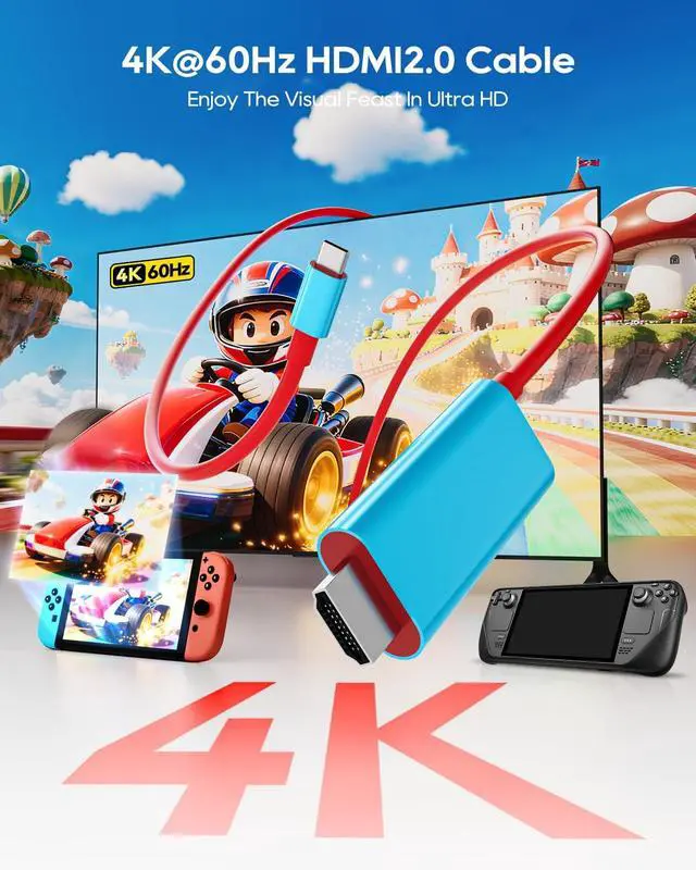 Whether you need a reliable Steam Deck charger or a Switch charger, this kit has you coveredready to use right out of the box. ^^ 4K/60Hz Ultra HD Output with Advanced HDMI Adapter TechnologyElevate your visual experience with this high-performance HDMI adapter. Supporting 4K@60Hz video, 5.1 surround sound, and 18Gbps bandwidth, it ensures smooth, real-time transmission without lag. The integrated smart chip enhances color and clarity for vibrant, distortion-free images on any compatible display.
