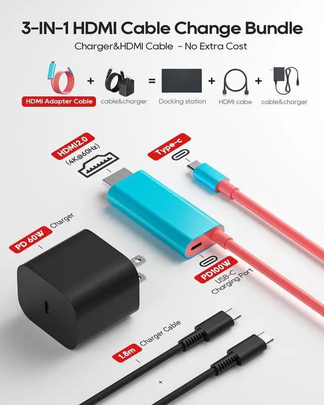 The Ultimate Portable & Travel Dock for Switc 1/OLED & Steam DeckSay goodbye to bulky setups. This all-in-one HDMI cable is the perfect portable dock and travel dock that replaces the original dock with a sleek 2-meter design. Weighing just a fraction of the original, it delivers the same high-quality performanceideal for big-screen gaming on the go, whether youre traveling, in a dorm, or at a friends place. ^^ Full 60W Charging Kit Included Your All-in-One Power & HDMI AdapterNever worry about power while you play. We include a complete 60W power adapter and AC adapter, making it the ultimate charger for Switch 1/OLED & Steam Deck.