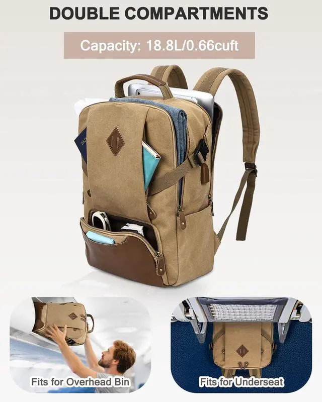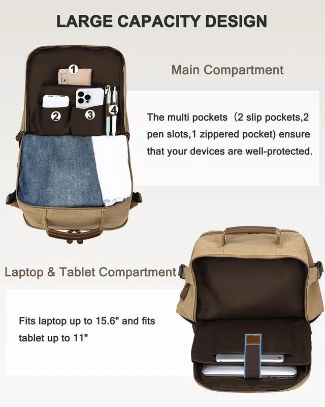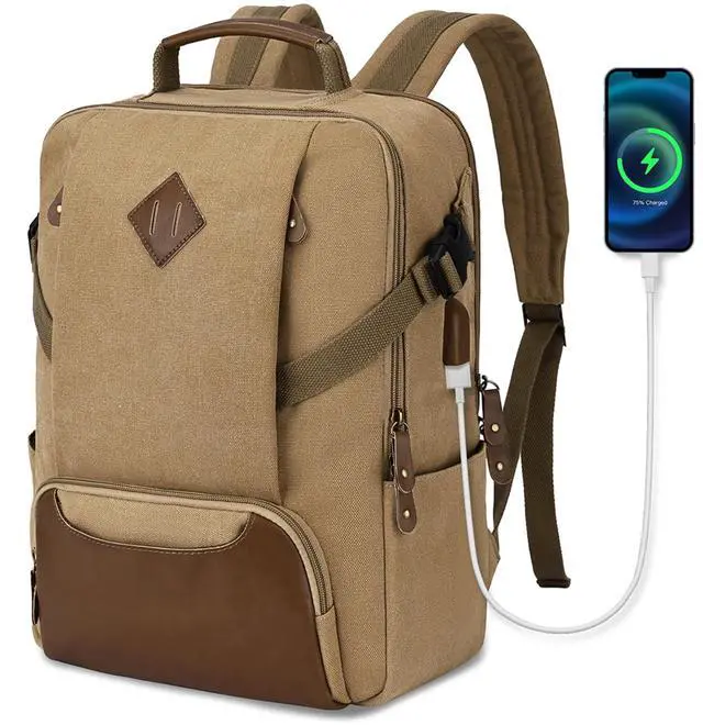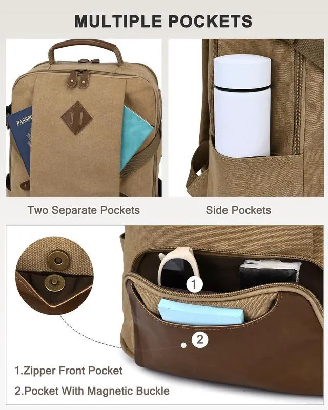High Quality: Perfectly combined with vintage outlook and durability, this vintage backpack functionally shows its two main large compartments with plenty of interior and exterior pockets. This Kasqo college backpack is sturdy and eco-friendly with the water-resistant canvas. Front faux leather magnetic button pocket and the adjustable side buckle strap nicely maintain its fashion. You could charge your phone through the USB charging port on-the-go.