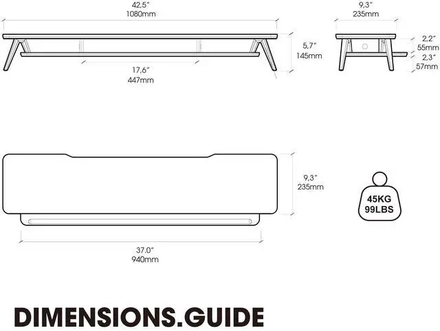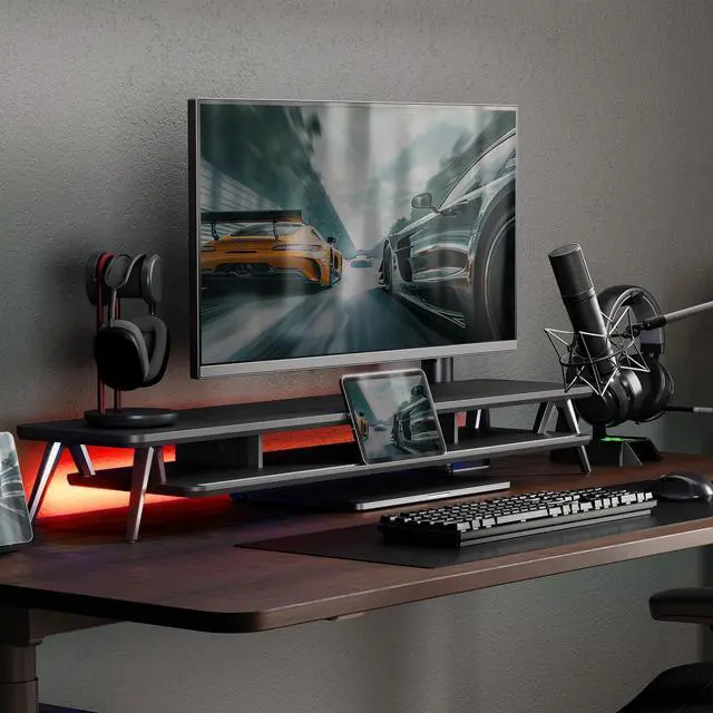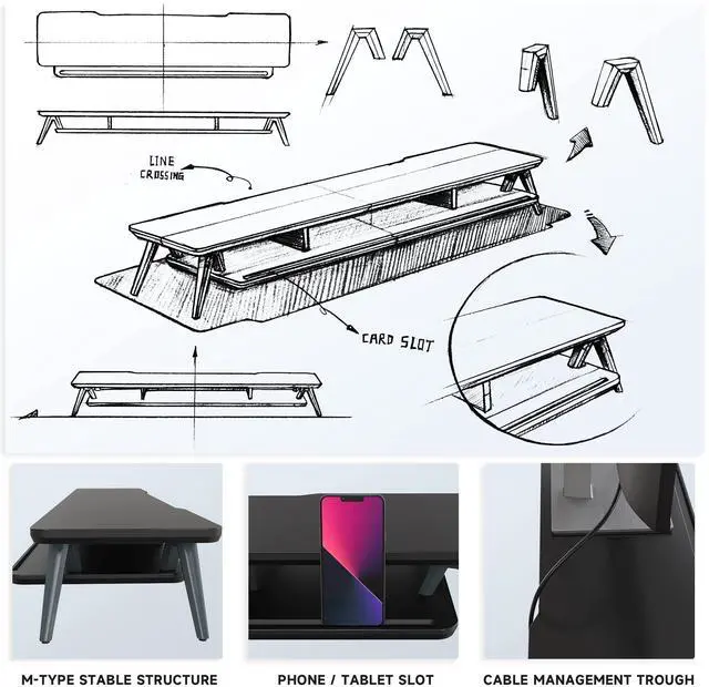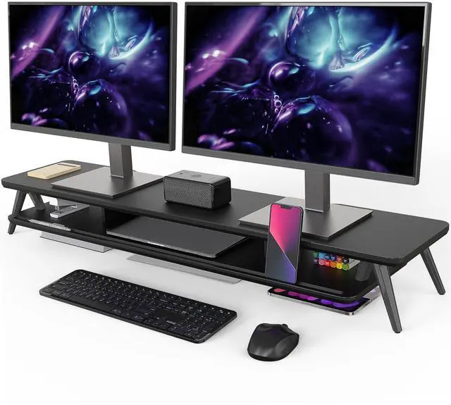 ^^ 2 TIER DESKTOP ORGANIZERAt longest 42.5 inch wide, longer size with more space. This laptop riser is big enough to support two monitors. It has 1 universal device holder slot and 3 high capacity compartments. You can easily store your office accessories & supplies under your monitor stand to keep your desktop tidy. Our monitor stand rise comes with cable management slots that can make your cord stay organized. ^^ AVOIDING SHOULDER/NECK PAINErgonomic design with 5.7 inches height of the desk stand to keep your screen at the best position, avoiding cervical spine problems caused by long-term bow in the process of working.