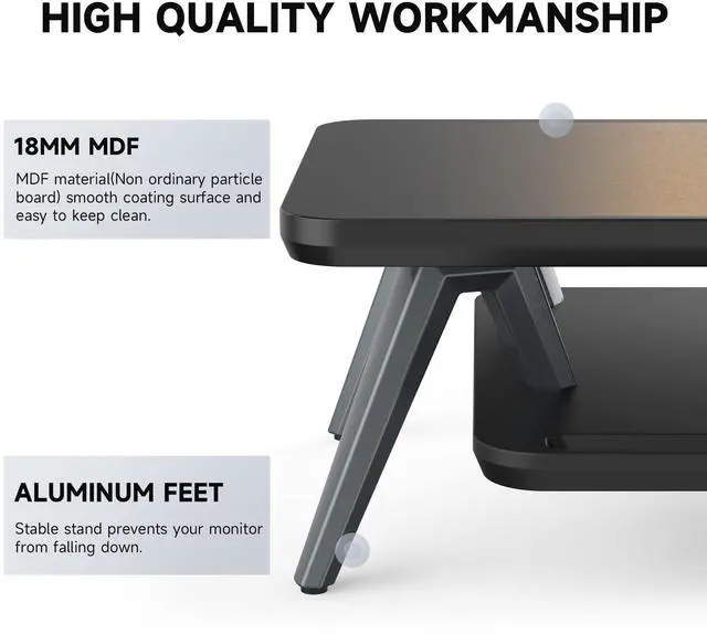 PREMIUM DURABLE PANELDual monitor stand is made of high-quality thickened MDF panel( 0.7 inch thickness). The surface is waterproofing and also prevents marks such as scratches and fingerprints. Round corner design will not bump or scratch hands ^^ STRONG & STABLE DESIGNSolid aluminum footing providing strong support, max holding capacity 88lbs/40kg. Comes with 4 rubber pads that make the computer monitor stand more stable, and the desktop remains scratch-free, even at high temperatures or under squeezing. The metal foot will not be out of shape and it will not wobble and sag or crack over time.