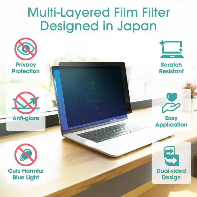 ^^ Unmatched Privacy: Our advanced multi-layered film filter, developed in Japan, ensures unrivaled privacy. It blocks side views while maintaining a crystal-clear screen straight-on, safeguarding your privacy and protecting your eyes from harmful glare, UV, and blue light. Only the 30 angle directly in front of the screen is visible at any distance.