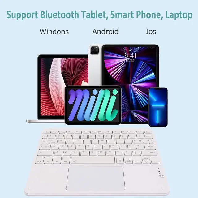 Ultra-thin Design This Bluetooth keyboard with touchpad has an ultra-slim design with a thickness of 0.27 inches and a keycap design that fits the size of your fingers. Not only is it easy to carry and travel with, but the experience of using it is also more comfortable. Efficient Touchpad Design The Bluetooth keyboard with a touchpad makes it easier to work and gives you the same experience as a laptop without taking a mouse with you when you're on the go. Multi-device Compatible & Energy Saving -This Bluetooth keyboard for tablets is compatible with iOS, Android, and Windows Tablets, Laptops, and mobile Phones, such as iPad 10.2 2019, iPad 10.9 2022, iPad Air 10.5 2019, iPad mini 5 2019, new iPad Pro 12.9 /11, Surface Go, Surface Pro, iPhone Xs Max, Samsung Galaxy Tab S6 Lite, S7, S7+, S8, S8+, S7 FE, A8, A7 Lite, A7 and etc.