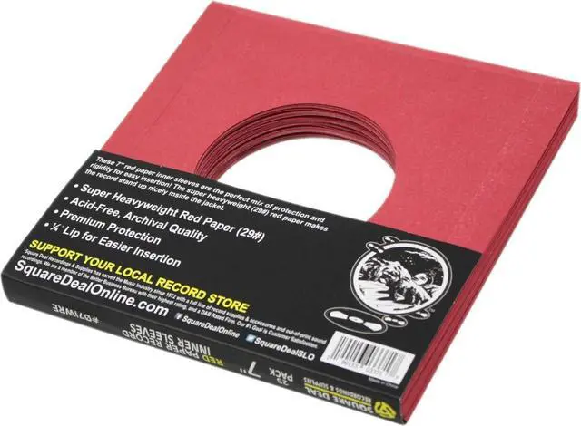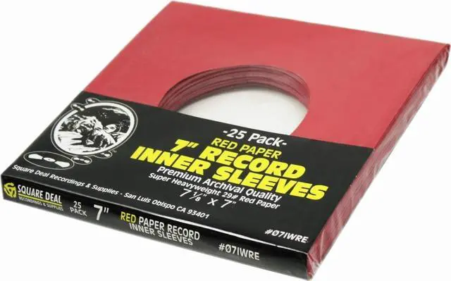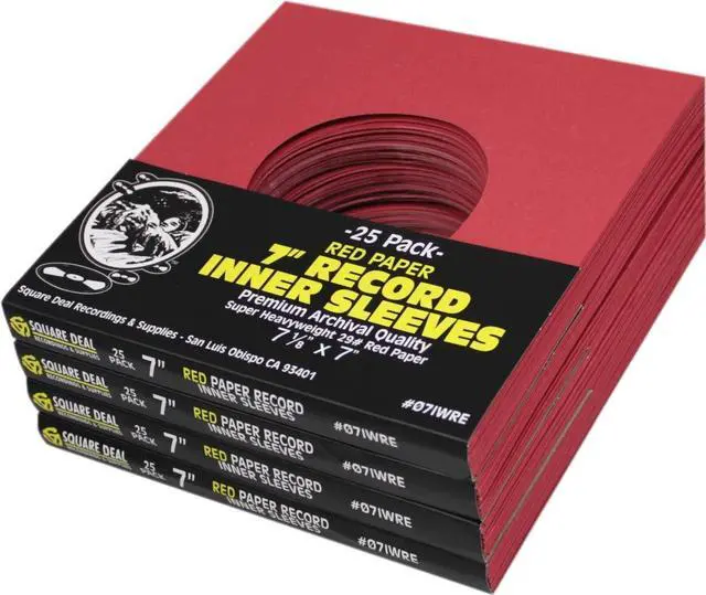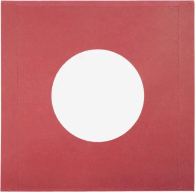 These are 45rpm red paper inner sleeves with a hole. The inner sleeves measure 7-1/8" x 7" (or 181mm x 178mm). The sleeves feature a 1/4" lip between the front and the back for easy machine insertion. The sleeves have square corners and are made from heavy-weight paper (29#).