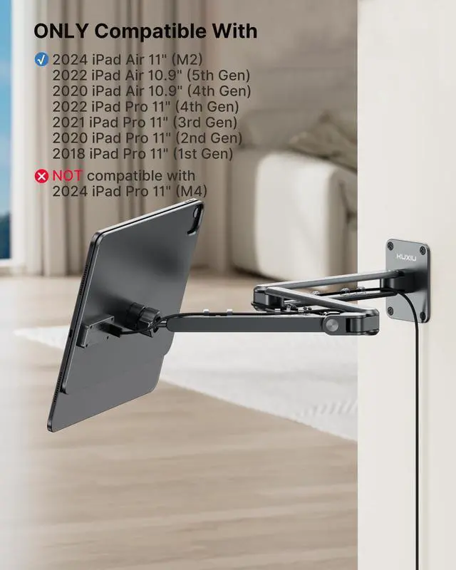 M2: Designed exclusively for the iPad Pro 11" 1st/2nd/3rd/4th, iPad Air 10.9" 4/5th, this iPad wall mount ensures a perfect fit and reliable performance. It is not compatible with any other iPads, including iPad Pro 11" M4 (2024), iPad mini models, or Android tablets. For optimal performance, make sure your iPad case is magnetic and features the Smart Connector adapter for secure mounting and charging.