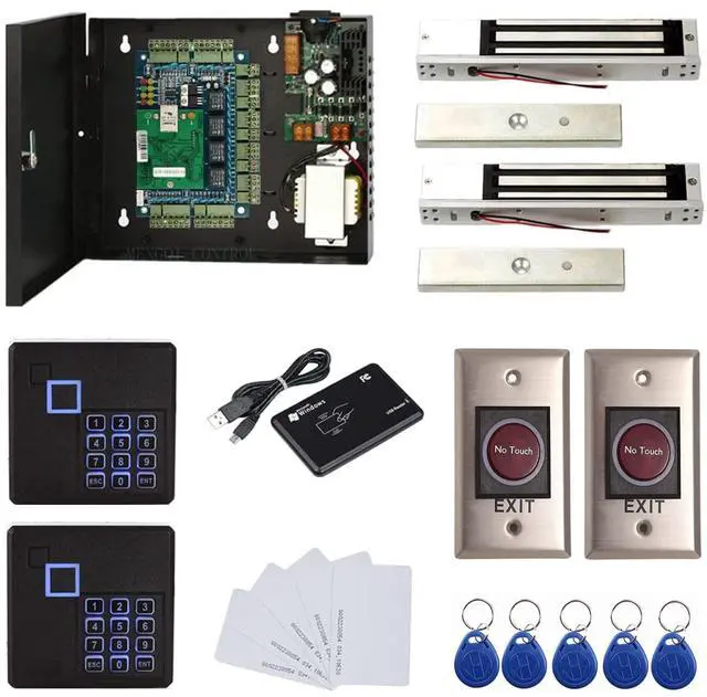 Control 2 doors, get in door by swiping card/key fob, inputting PIN code or using card + PIN, and get out door by infrared button. Can store/download/check entry records and generate report by professional management software. Exit button can perfect install on US electrical box. ^^ Control of memory up to 20, 000 user / up to 100, 000 logs. Auto open/close at any pre-set time during any day. Support "who" can enter which door at certain time, authorized access control.