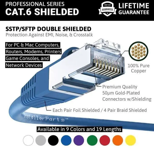 Shielded CAT6 Cable: InstallerParts SSTP / SFTP (Screened Foil Twisted Pair) patch cables are doubled shielded with an overall braided screen and foil screened twisted pairs for the best prevention of noise, electromagnetic interference and crosstalk. ^^ High