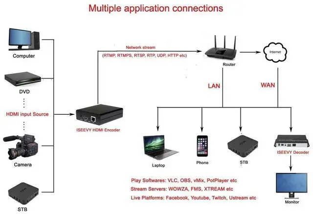 It supports max 1920x1080@60 HDMI source input, then you can get max resolution 1920x1080@60fps H. 264/AVC, MJPEG video and AAC, AAC+, AAC++, MP3, MP2, AC3, Opus, G. 711 audio network stream ^^ It supports SRT, HTTP, RTSP, SRT, RTMP, RTMPS, HLS (M3U8), FLV, TS, UDP, RTP, Multicast, Unicast network protocols. ^^ You can use it to live on YouTube, Facebook, Ustream, Livestream, Twitch, Dacast, Vimeo, Meridix, Streamspot, Tikilive, Netrmedi these platforms.