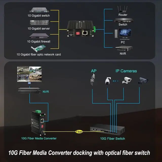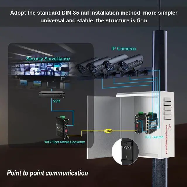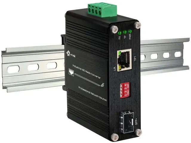 RJ45 to 10G SFP+Fiber media converter supports 10G fiber data rate switching and 10G/5G/ 2.5G /1G/100Base-T RJ45 to 10GBASE-X SFP+ slot. ^^ 12-48V Wide Voltage10G fiber optic transceiver with DC12-48V wide voltage input will solve the problem that you only have 12V or 24V centralized power supply or solar power supply. ^^ Redundant Power InputThe industrial SFP+ fiber converter supports 2-way industrial grade power interface input, one set of power supplies fails, and the other set can still work. ^^ Industrial Grade QualityThe DIN-Rail 10G media converter with industrial grade aluminum alloy casing can work in a wide temperature range from -40C to 80C and lightning protection which make it can adapt to various harsh environments.